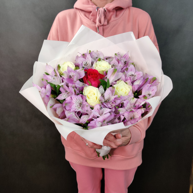 Очень милый букет из роз и альстромерии. Прекрасно подойдет на любое торжество. Состав Роза - 5 шт. Альстромерия - 9 шт.