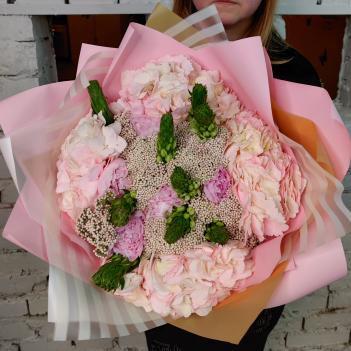 Состав: Упаковка (пленка с лентой), Фисташка 20шт., Роза россия/ кения 40 см 51шт., Пиафлор (оазис) 3шт., Корзина плетенная