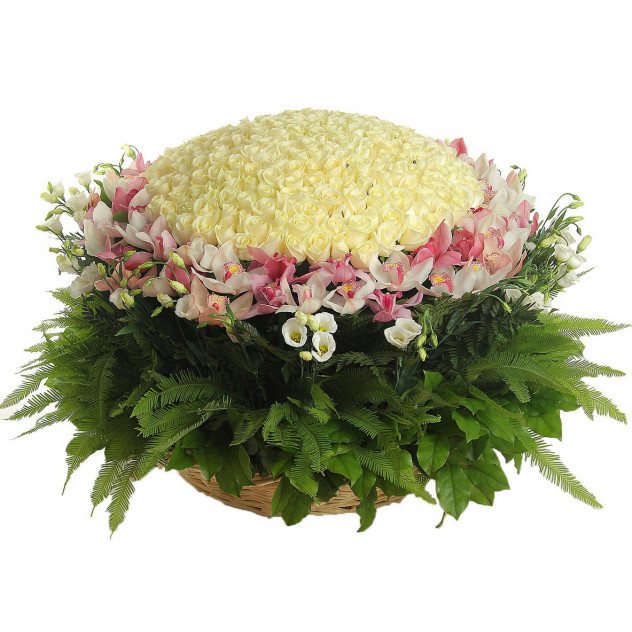 Состав: Упаковка (пленка с лентой), Лизиантус 20шт., Роза белая 60 см 250шт., Папоротник 62шт., Салал 40шт., Корзина плетеная, Пиафлор (оазис) 8шт., Орхидея цимбидиум (ветка) 4шт.
